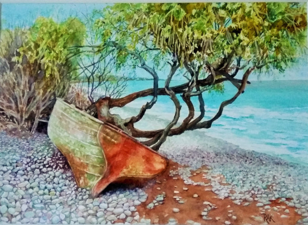 Watercolour on Canson quality paper. Mounted under glass in washed oak frame.